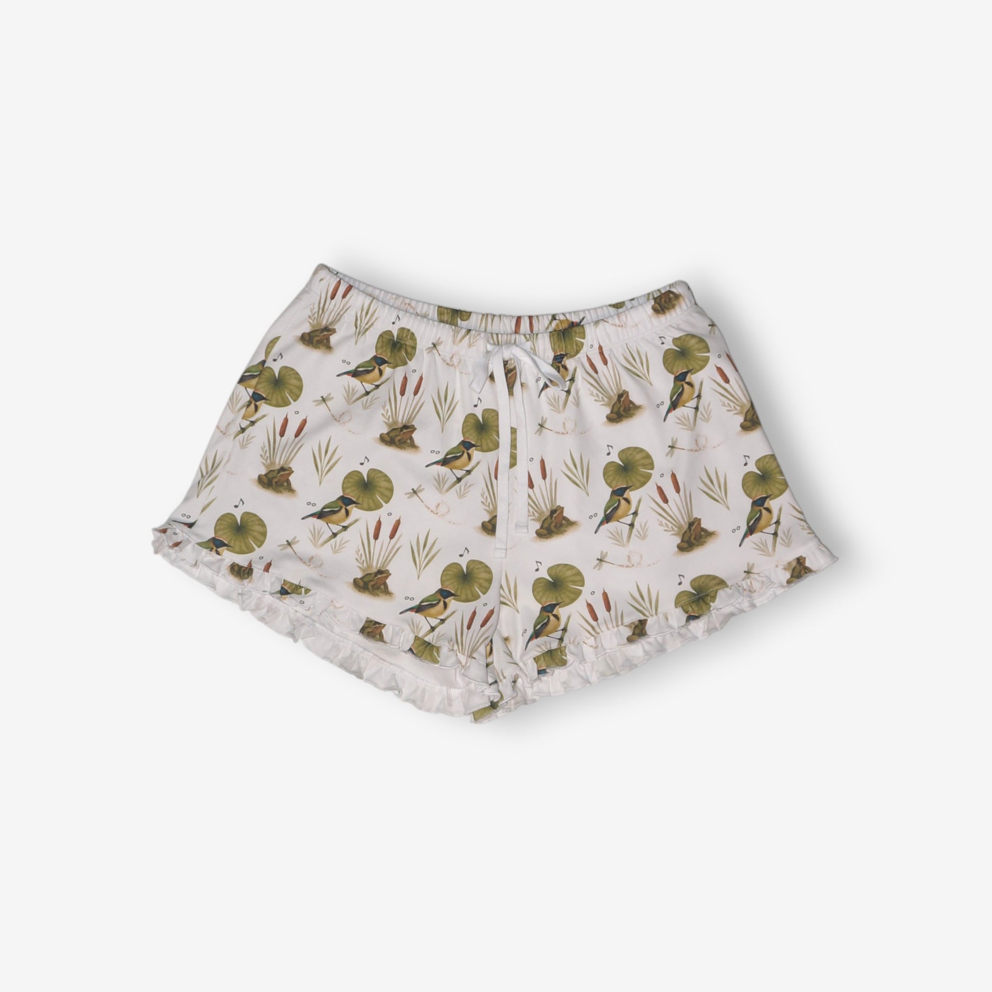 Incluye camisa de manga corta con botones y delicados vuelitos junto a un short estampado inspirado en la fauna chilena, creando un look femenino y lleno de identidad. Ideal para descansar o disfrutar momentos de relajo con estilo.