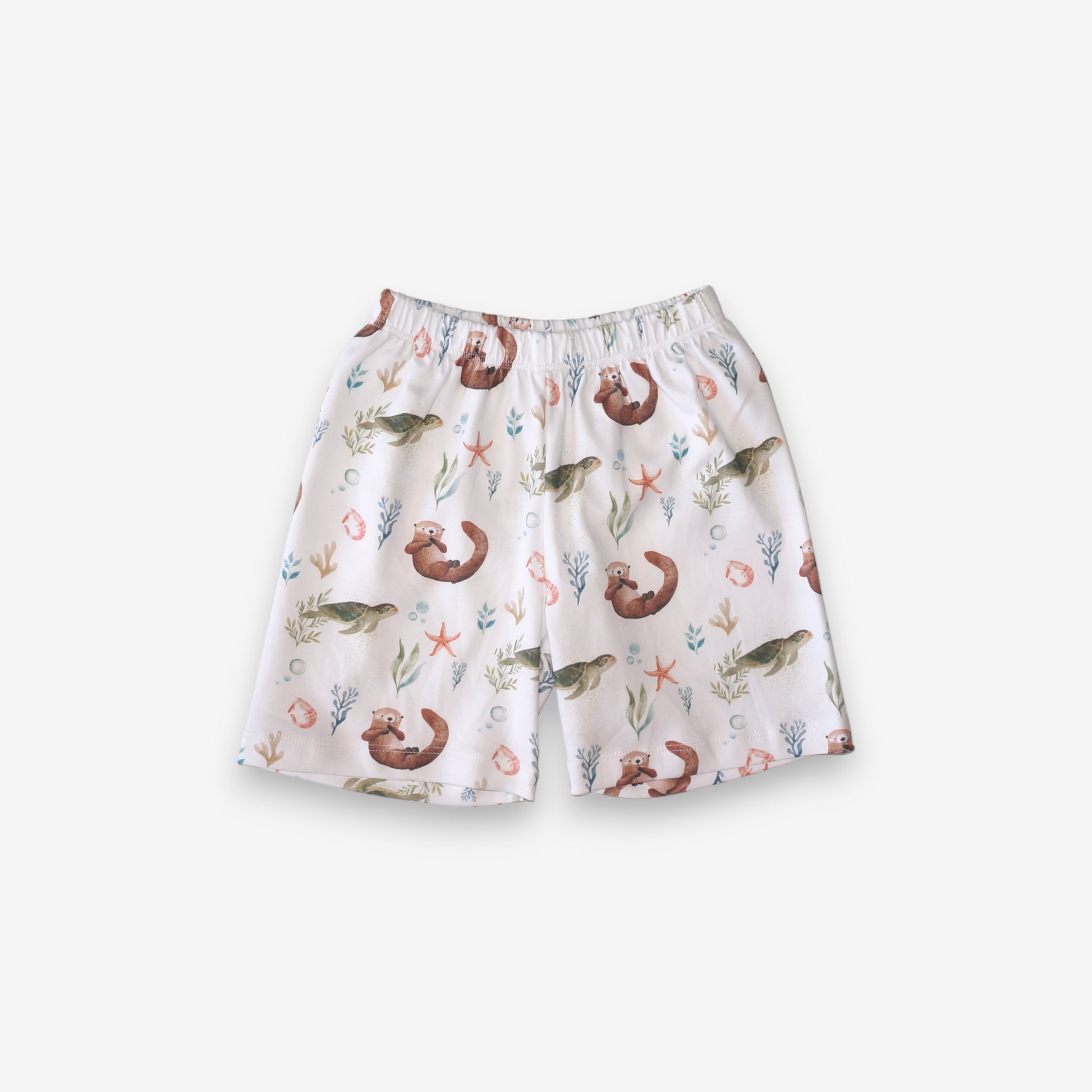 Incluye una polera lisa de cuello redondo y un short con estampado inspirado en la fauna marina y de río chilena, con ilustraciones exclusivas que conectan a los niños con la naturaleza.